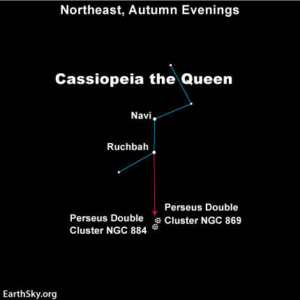 The famous Double Cluster in the constellation Perseus is not far from Cassiopeia on the sky’s dome. This chart shows how to use the W or M shape of Cassiopeia to find the Double Cluster. To appreciate them fully, look with your binoculars in a dark sky! More about the Double Cluster here.
