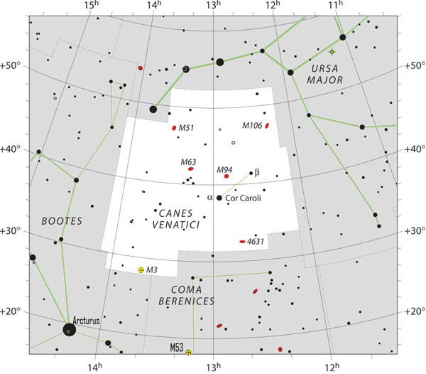 But the eastern star is now called Cor Caroli, or Heart of Charles, named for the patron king of the Polish astronomer Johannes Hevelius, who devised this constellation in 1690.